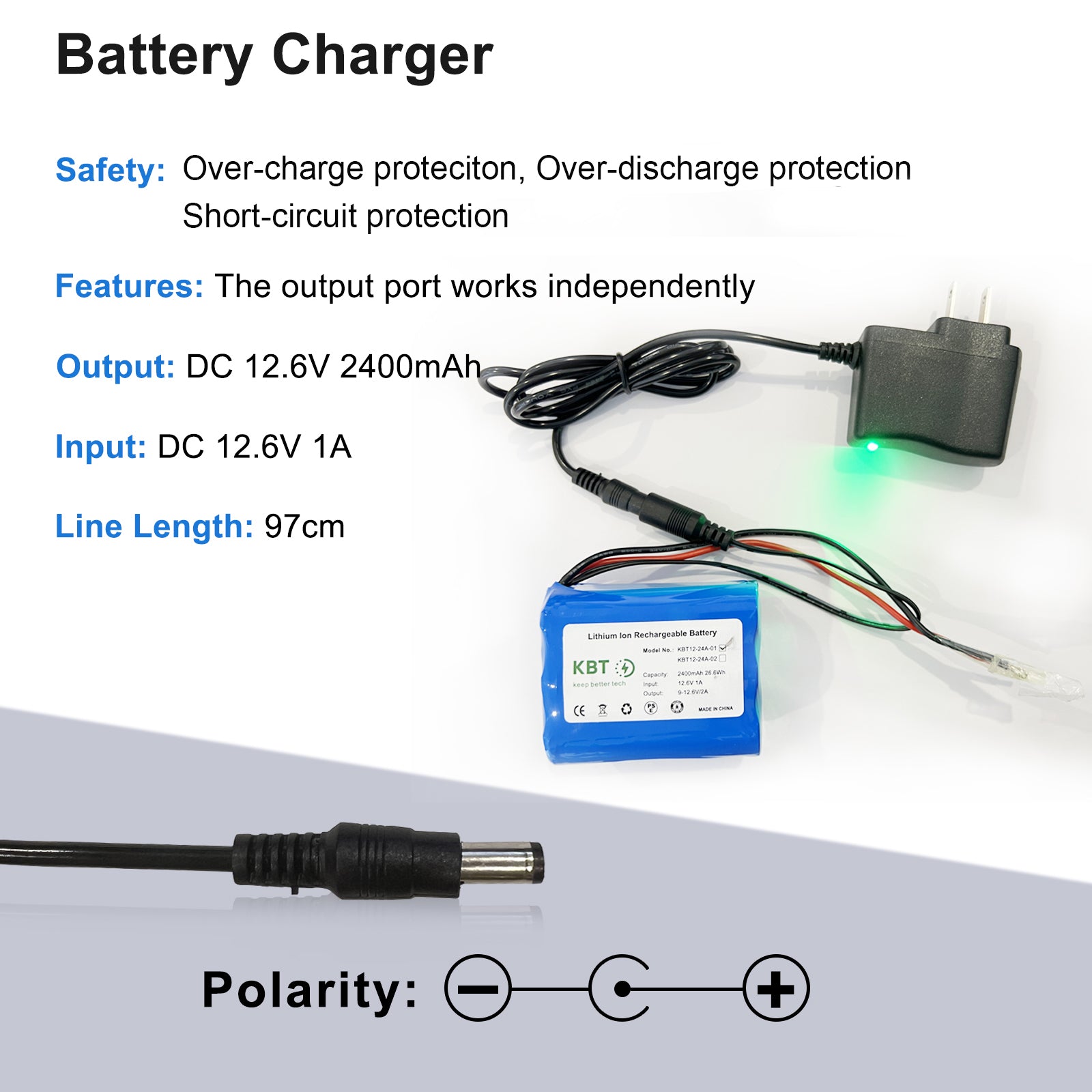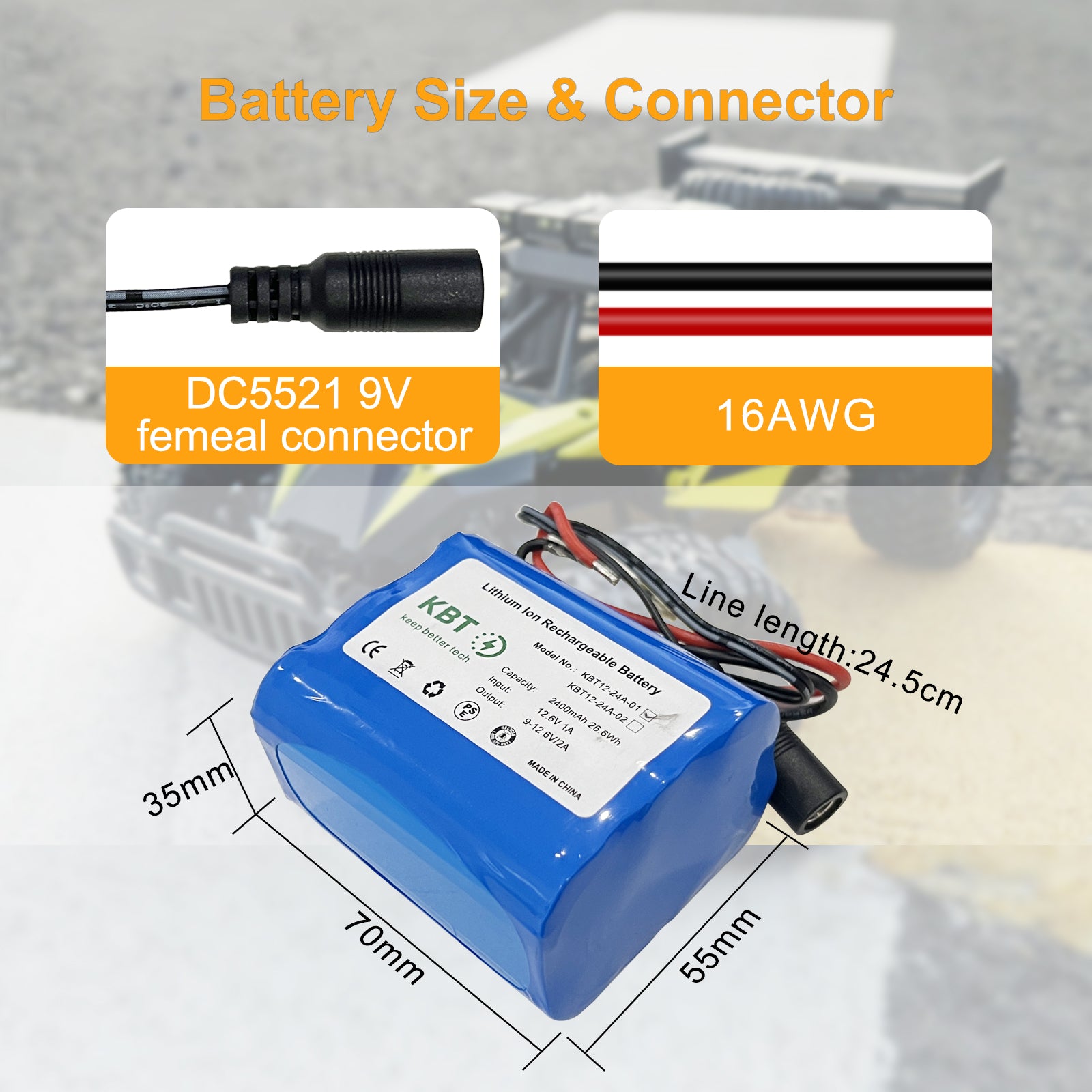 - Package includes: 1*12V 2400mAh battery pack, 1*12V battery charger, 1* cable connector.