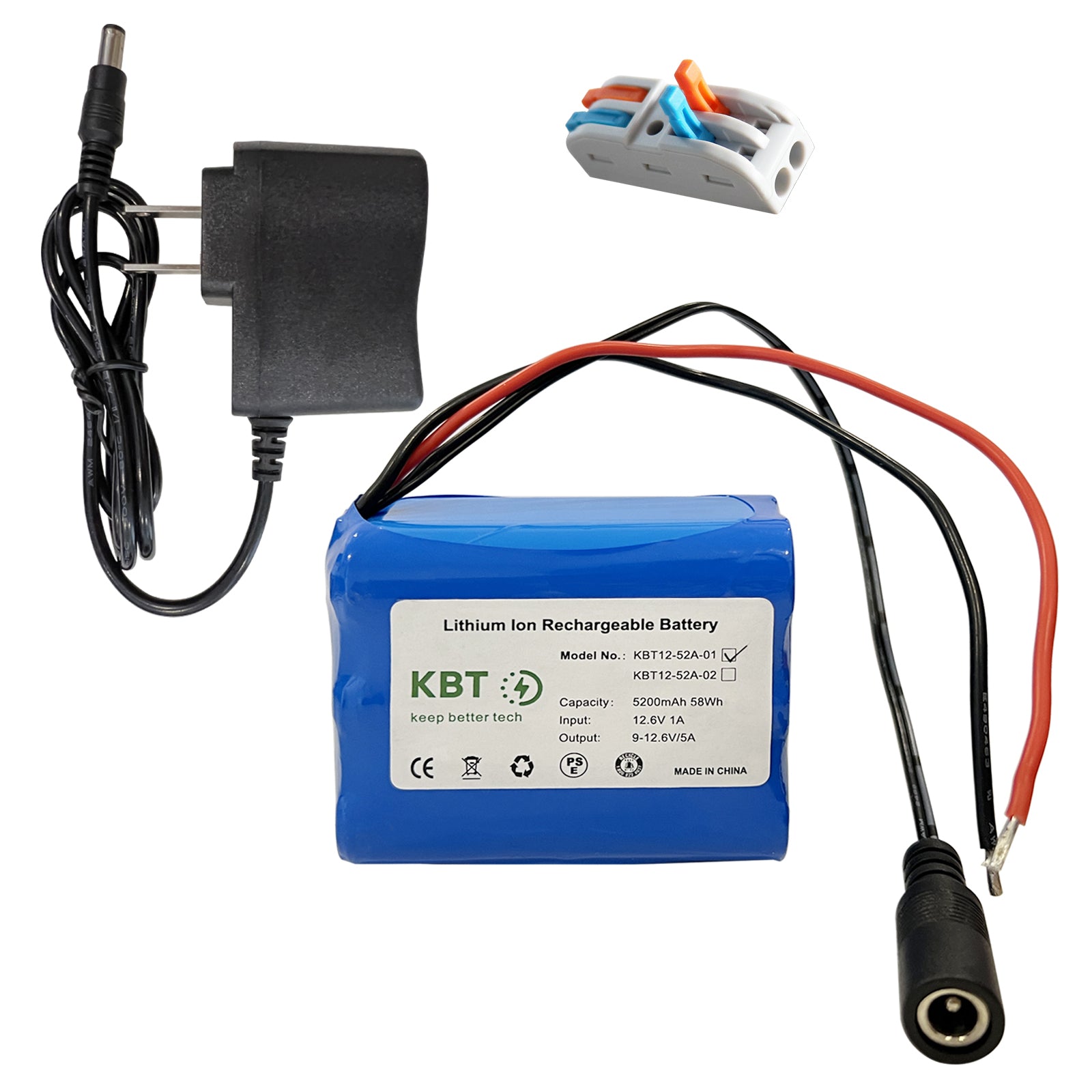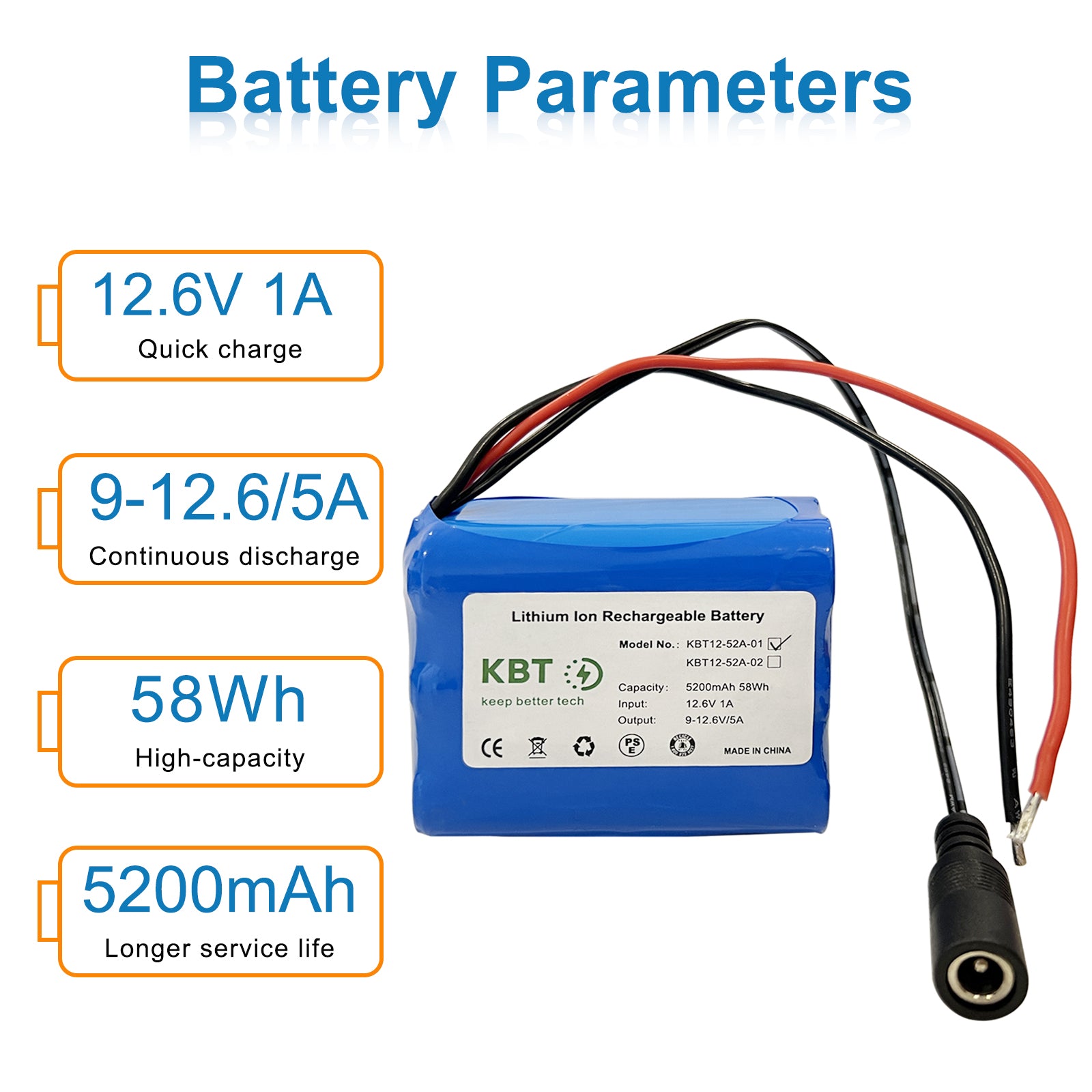 KBT 12V 5200mAh Rechargeable Li-ion Battery, Bare Leads Wire Replacement Battery Pack with Charger Compatible with 12V Devices RC Car, Boat, Robot, DIY, LED Light Strip, CCTV Camera