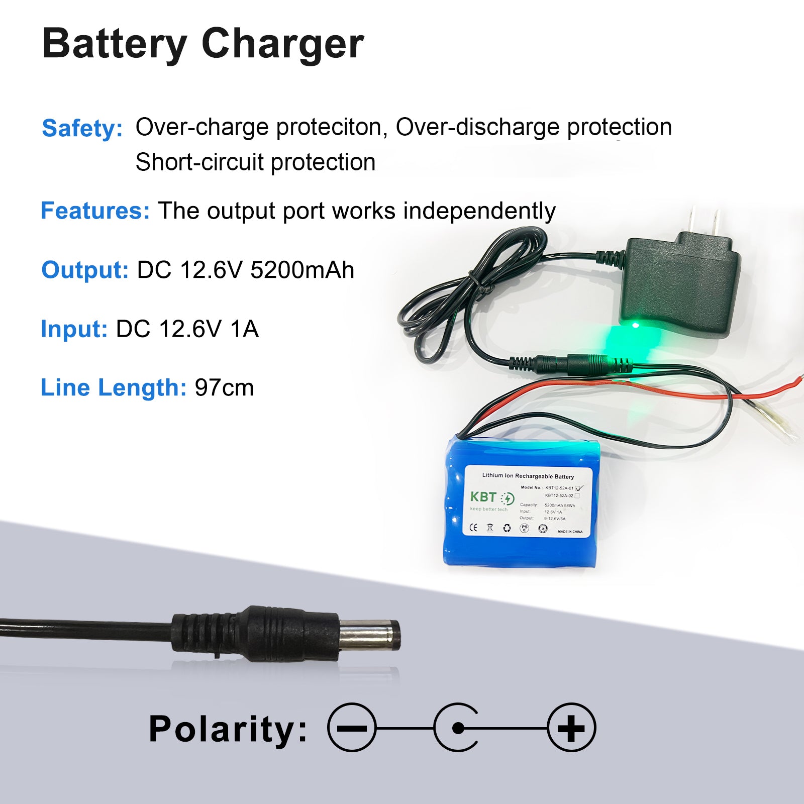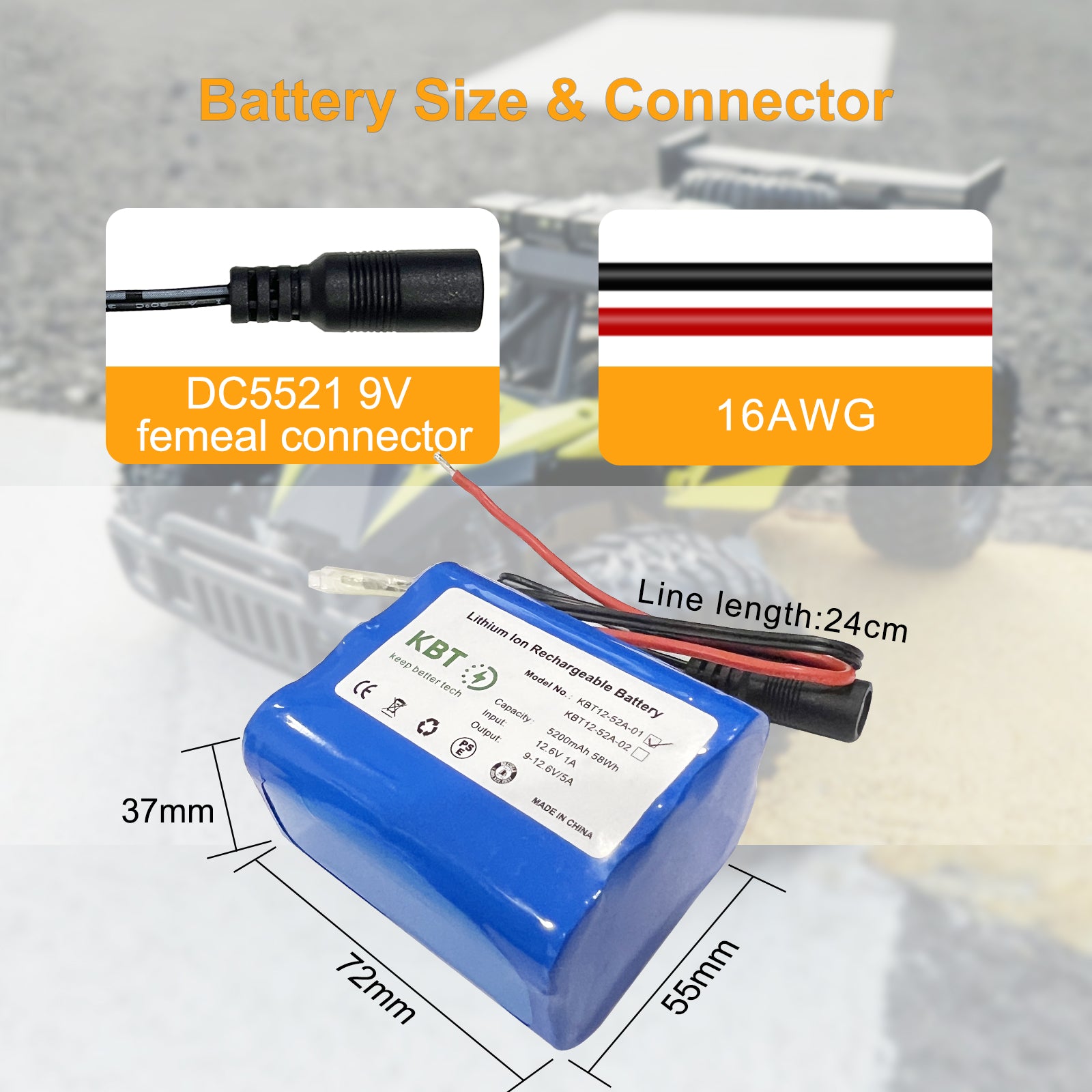 - Package includes: 1*12V 5200mAh battery pack, 1*12V battery charger, 1* cable connector. Battery pack size 70*55*40mm (L*W*T), battery weight about 295g, battery cable length 18cm, 12V charger cable length 90cm.